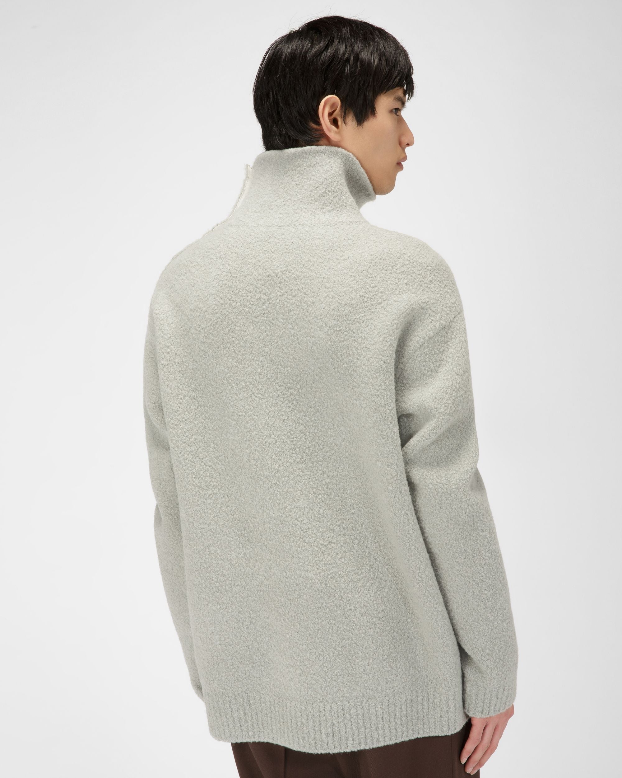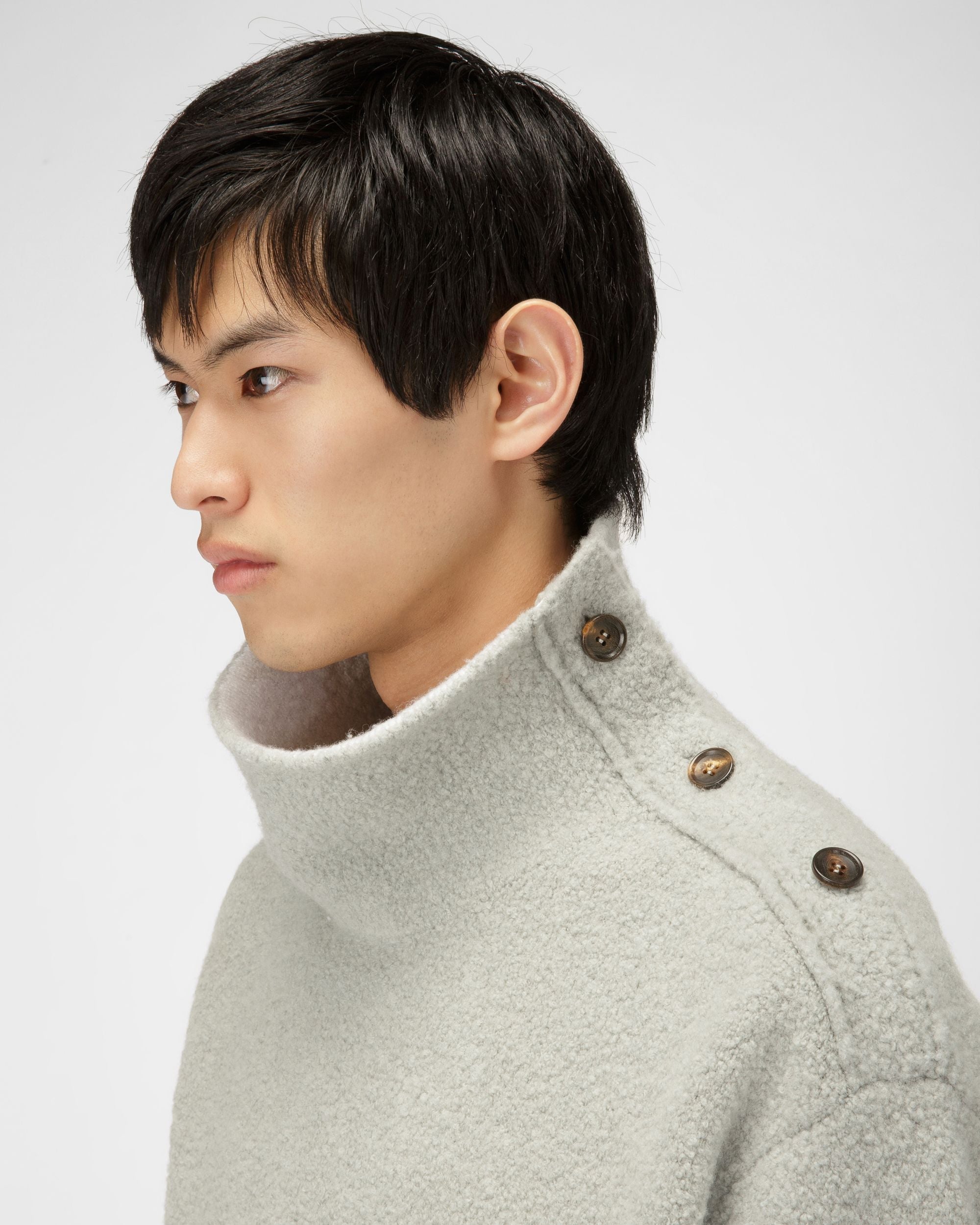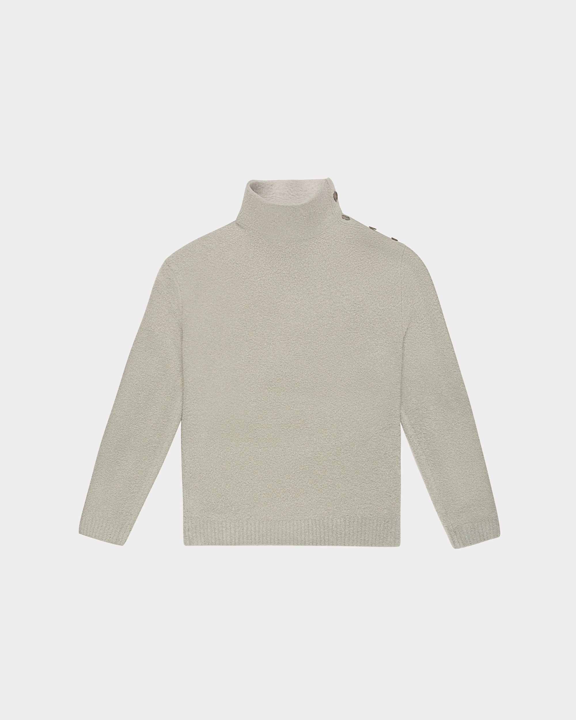 Crafted from light blue wool. this boucl?? roll neck infuses a knitwear staple with contemporary flair. Featuring buttons on the left shoulder. it is lined with contrasting Merino wool in bone.