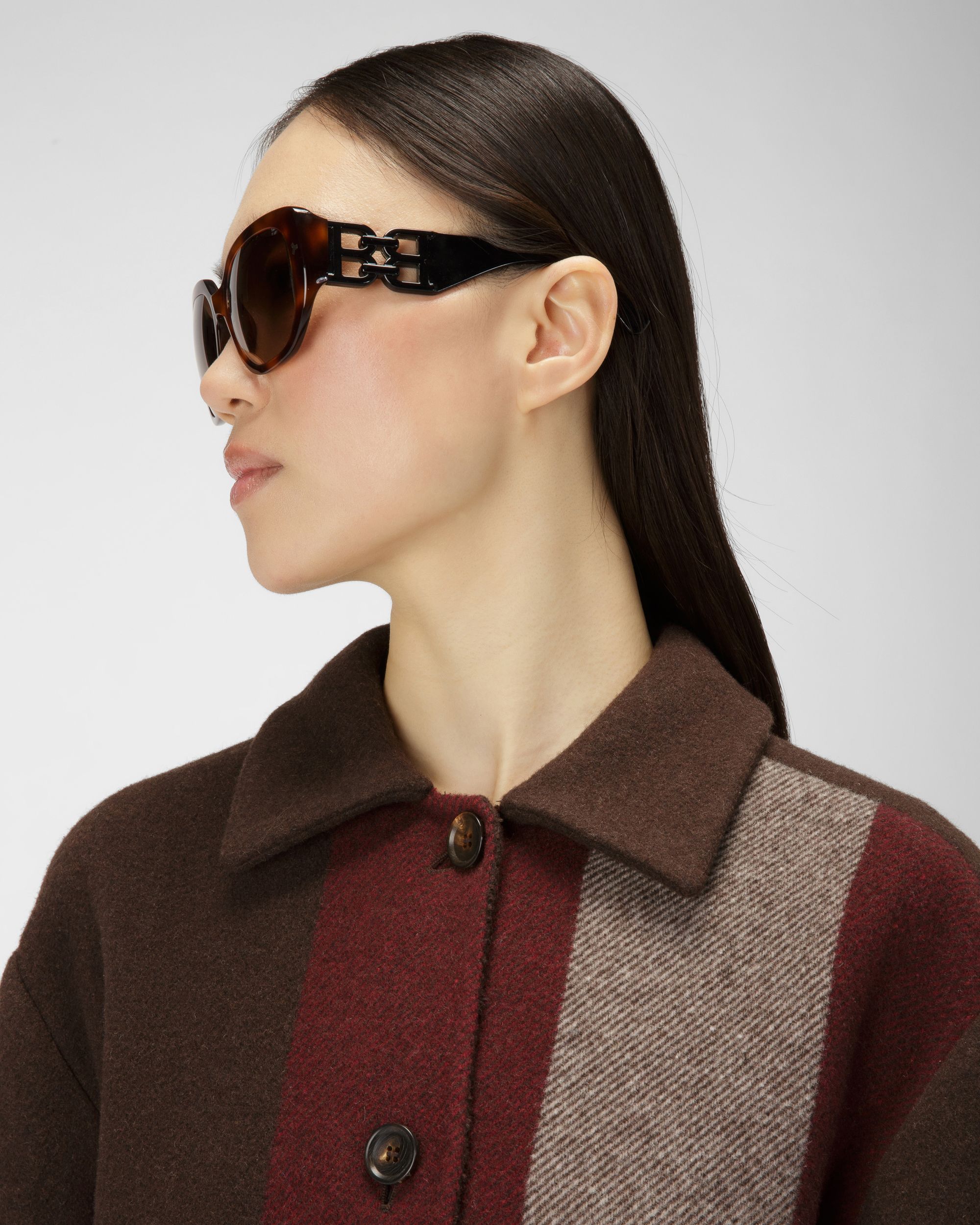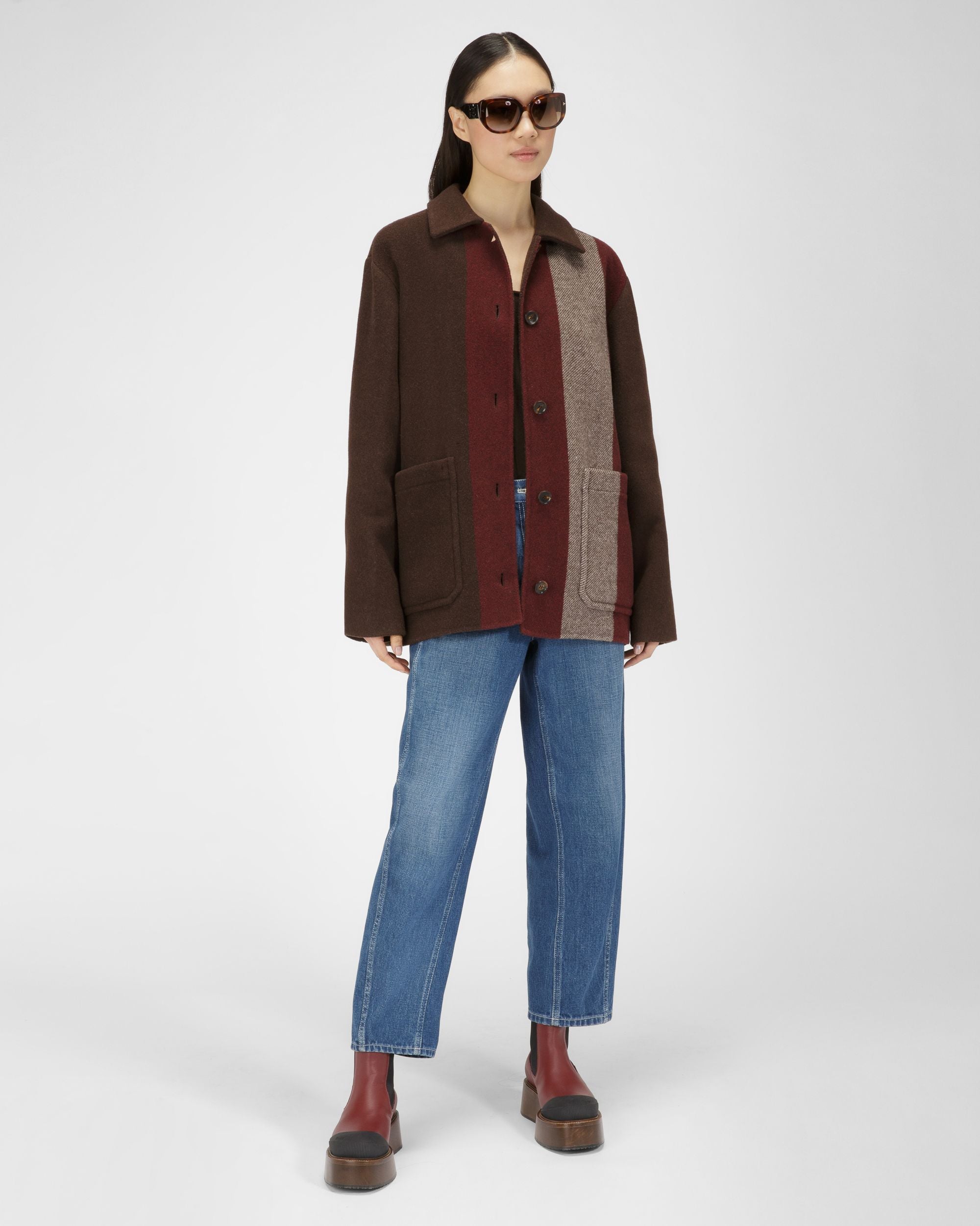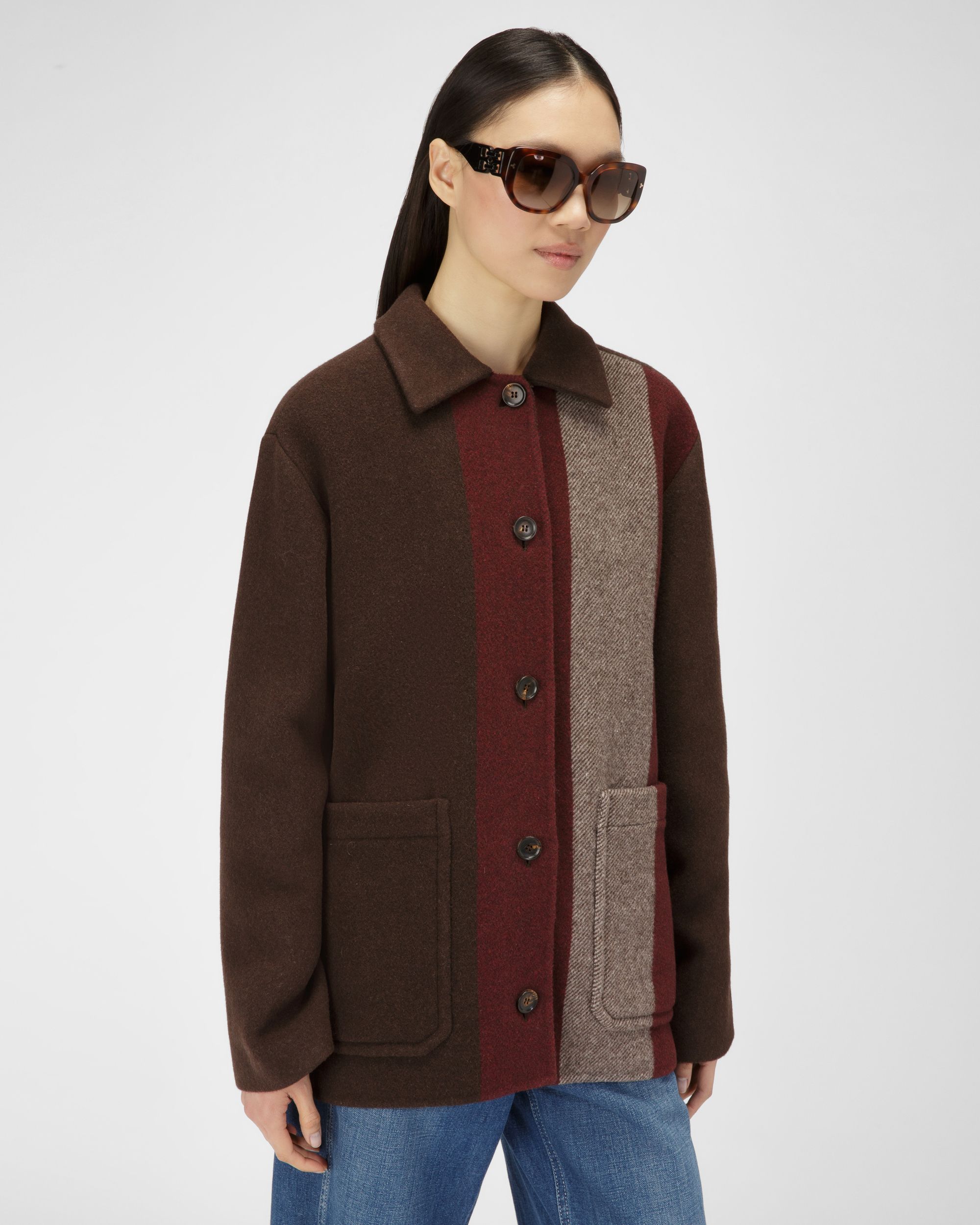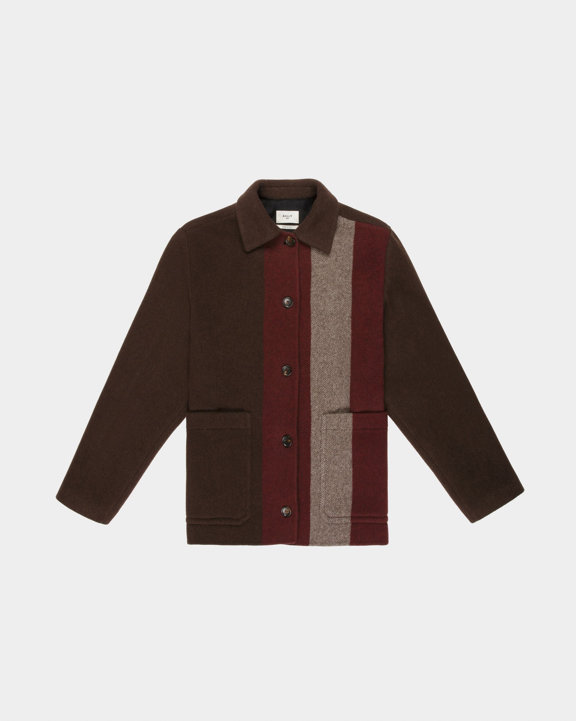 Cut from ebony brown wool blend. this jacket is adorned with a macro Bally Stripe at the front. Fastened by tonal buttons. it features two patch pockets at the front.