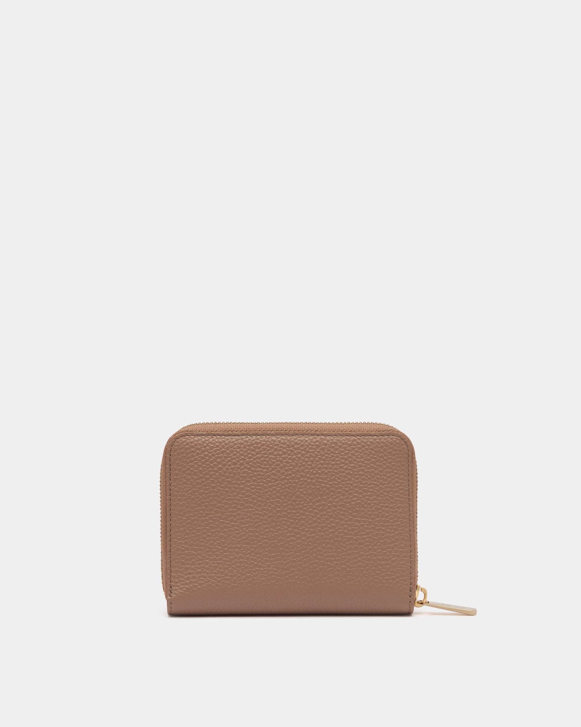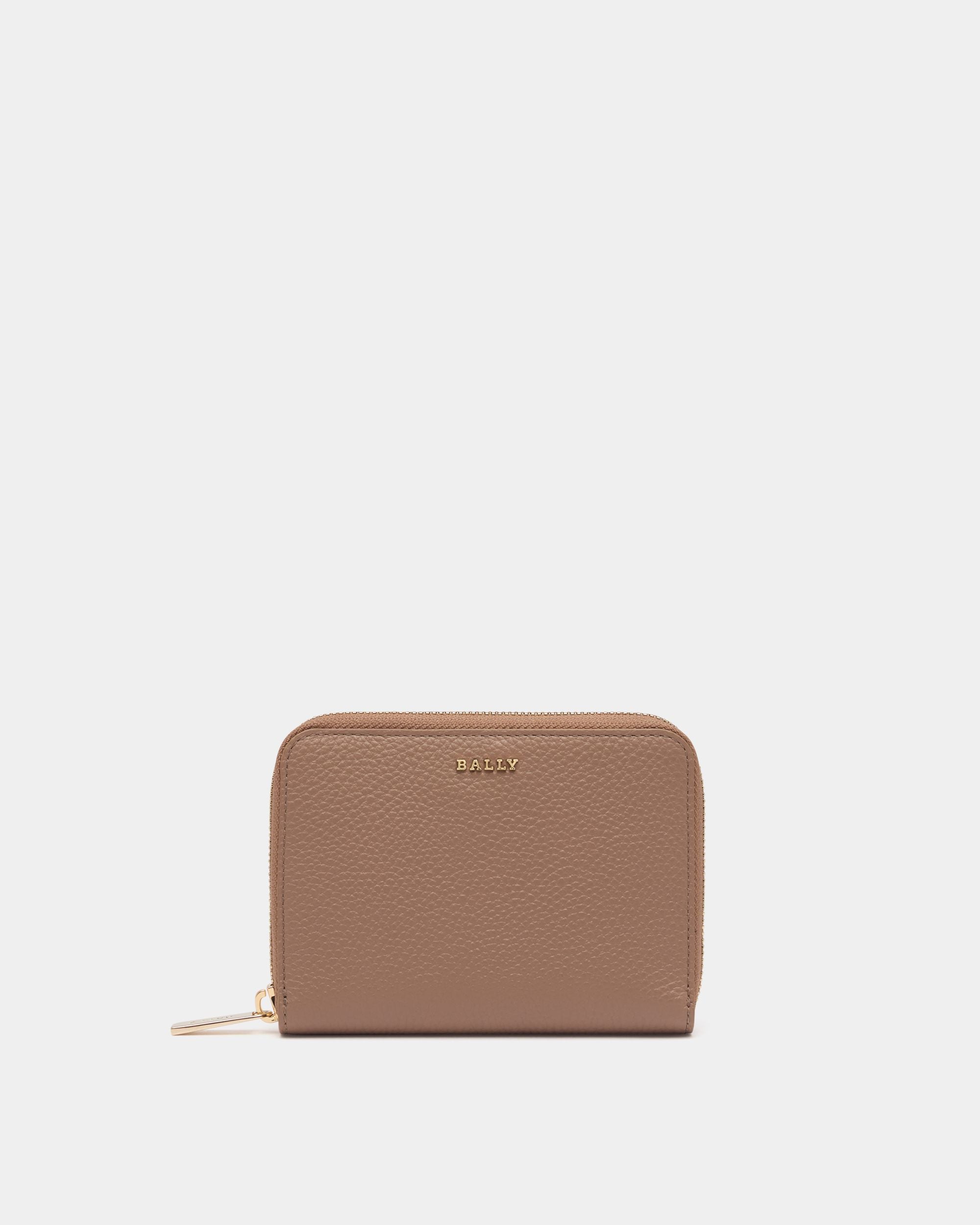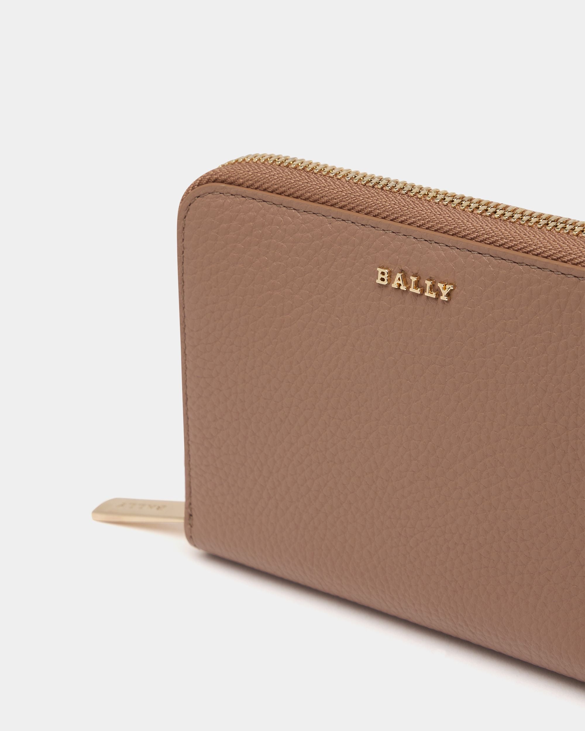 Essential zip-around wallet in beige leather with a grained finish. Gold-tone Bally logo hardware decorates the front.